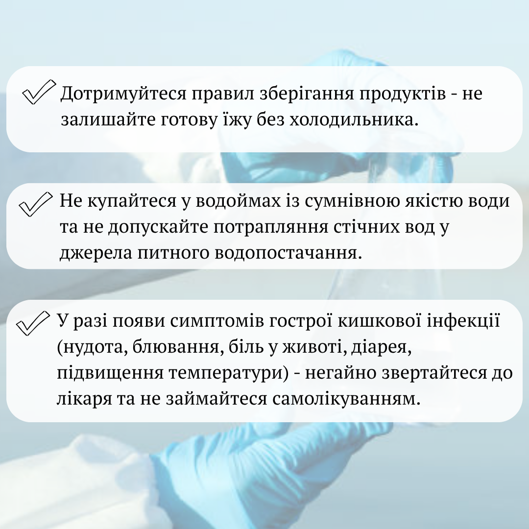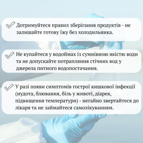 У разі появи симптомів гострої кишкової інфекції (нудота, блювання, біль у животі, діарея, підвищення температури) – негайно звертайтеся до лікаря та не займайтеся самолікуванням.