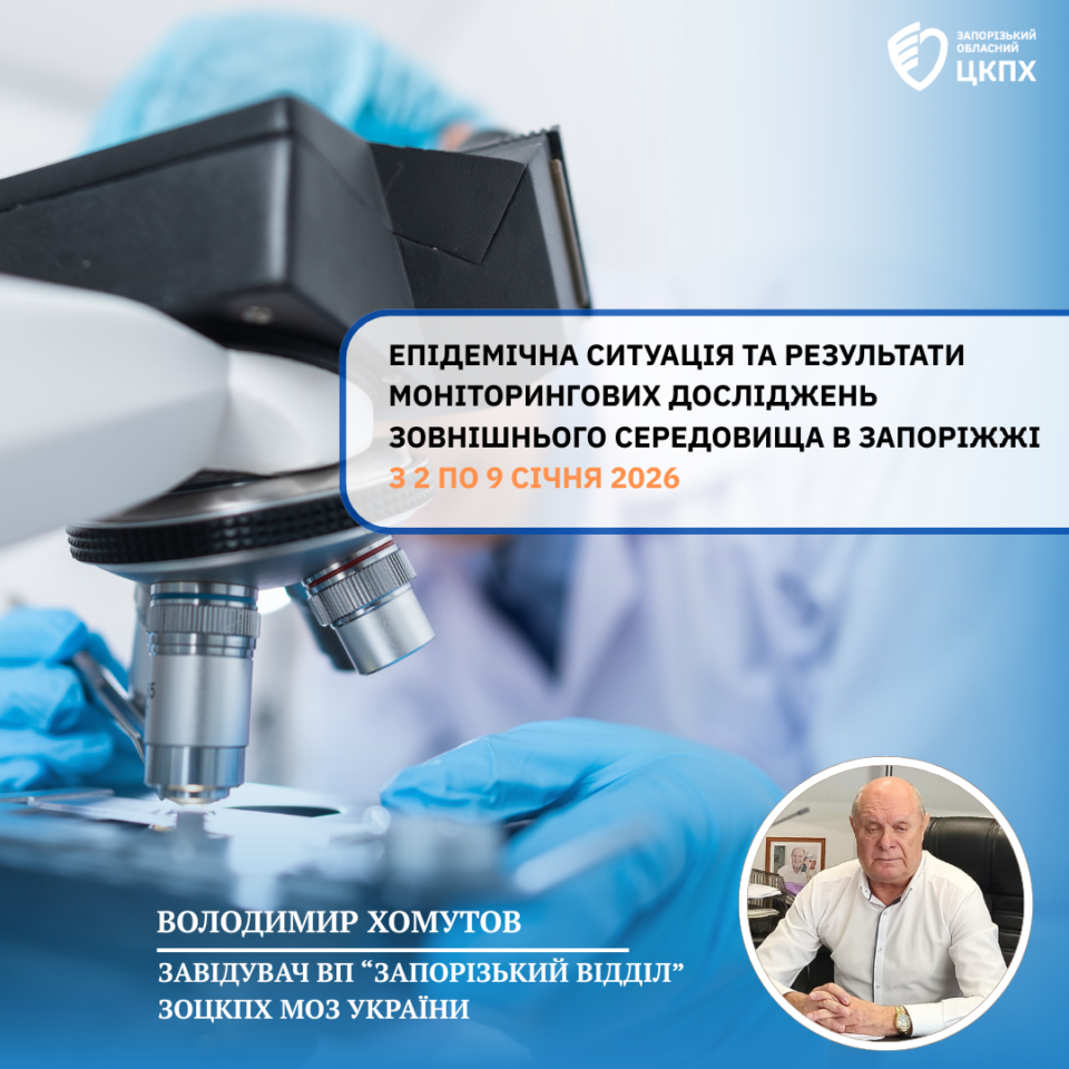 Фахівці відокремленого підрозділу «Запорізький відділ» Запорізький обласний центр контролю та профілактики хвороб на попередньому тижні, з 2 по 9 січня 2026 р., продовжували аналіз епідситуації та проведення моніторингових досліджень зовнішнього середовища в м. Запоріжжя.