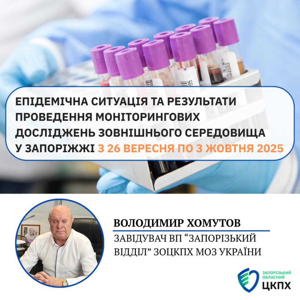 Про епідемічну ситуацію та результати моніторингових досліджень зовнішнього середовища у Запоріжжі з 26 вересня по 3 жовтня 2025