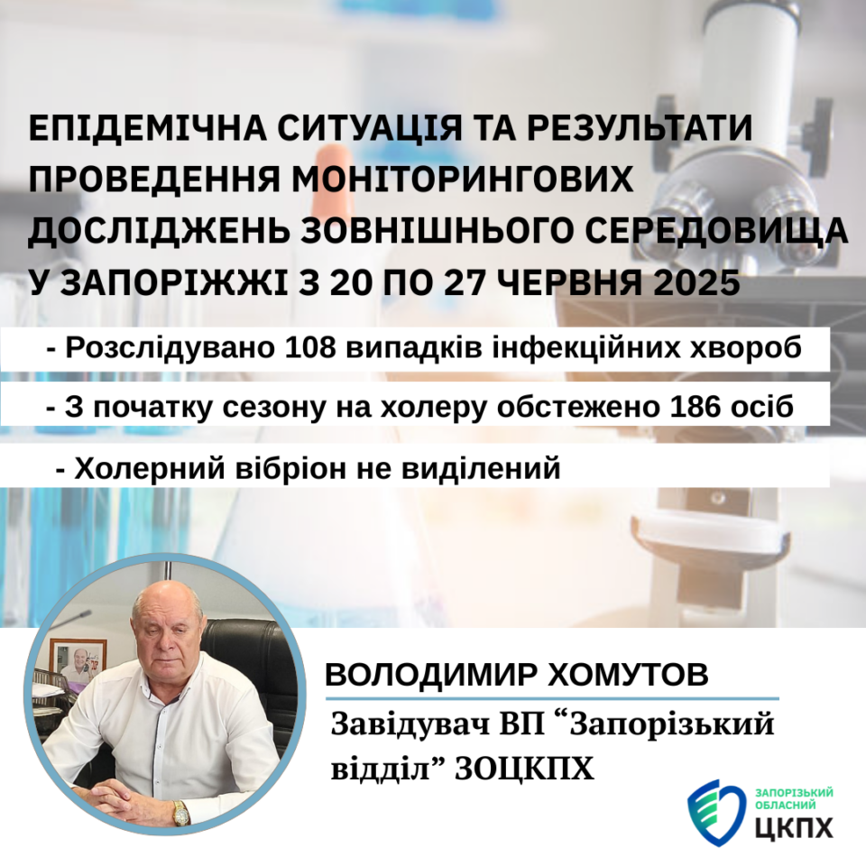 Протягом попереднього тижня, з 20 по 27 червня 2025 р., фахівці відокремленого підрозділу «Запорізький відділ» продовжували аналіз епідемічної ситуації та проведення моніторингових досліджень зовнішнього середовища в м. Запоріжжі.