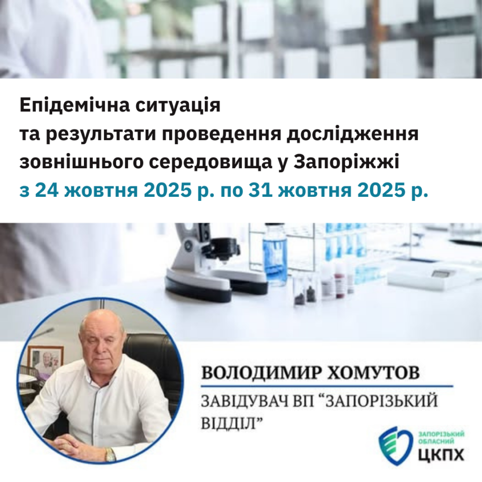 На попередньому тижні з 24 жовтня по 31 жовтня 2025 року фахівці Запорізького відокремленого підрозділу “Запорізький відділ” продовжували аналіз епідситуації та проведення моніторингових досліджень зовнішнього середовища в м. Запоріжжі.