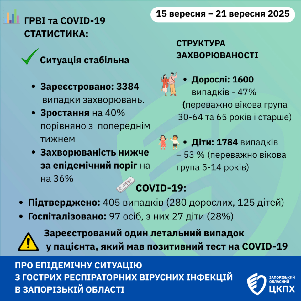 Про епідемічну ситуацію з ГРВІ в Запорізькій області з 15 вересня – 21 вересня 2025 року