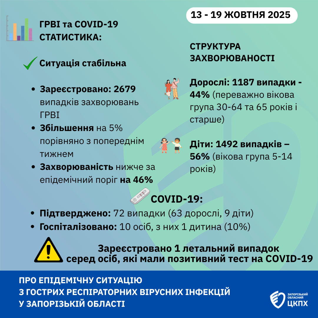 Про епідемічну ситуацію з ГРВІ у Запорізькій області за період з 13 по 19 жовтня 2025 р. в інфографіці
