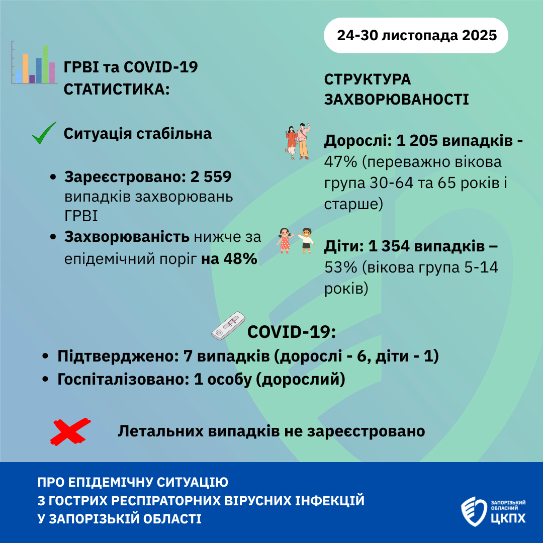Далі про епідемічну ситуацію з ГРВІ у Запорізькій області за період з 24 по 30 листопада 2025 року в інфографіці.