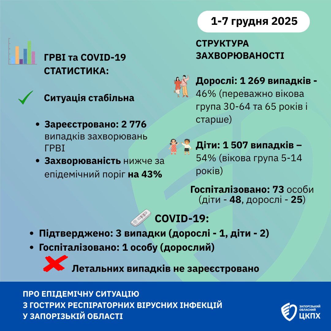 Далі про епідемічну ситуацію з ГРВІ у Запорізькій області за період з 1 по 7 грудня 2025 року в інфографіці.