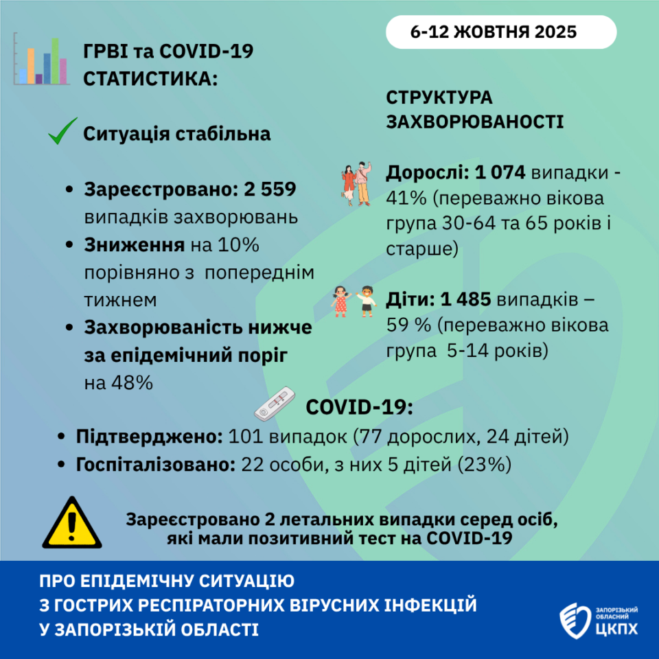 Про епідемічну ситуацію з ГРВІ у Запорізькій області за період з 6 по 12 жовтня 2025 р. в інфографіці