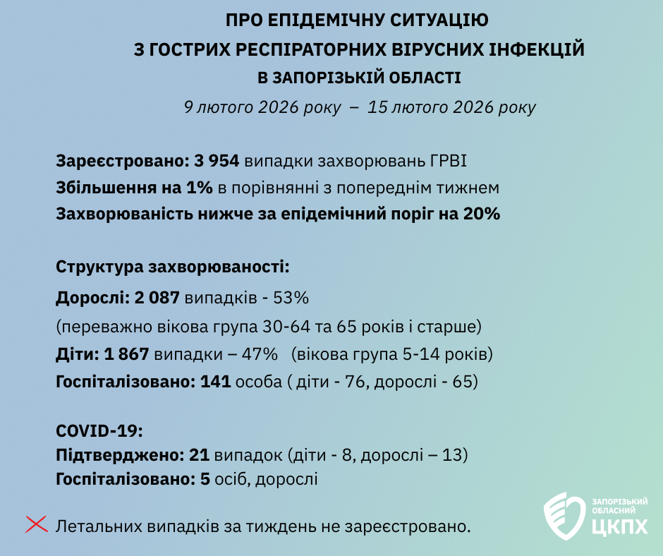Про епідемічну ситуацію з ГРВІ в Запорізькій області з 9 по 15 лютого 2026 року