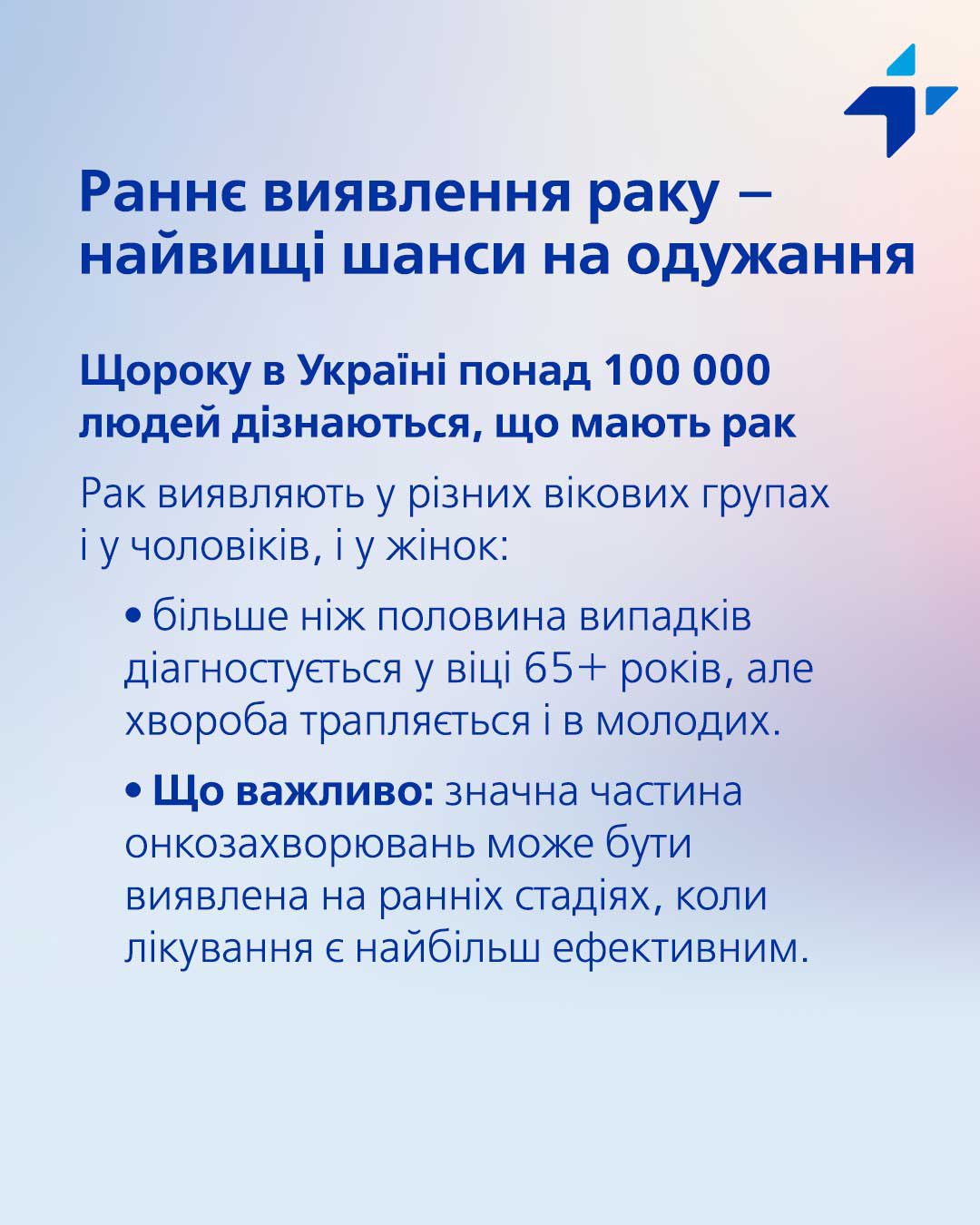 Рак – це не вирок. За умови раннього виявлення багато онкологічних захворювань піддаються ефективному лікуванню, дозволяючи зберегти якість і тривалість життя. Саме тому так важливо не відкладати обстеження та звертати увагу на сигнали власного організму.