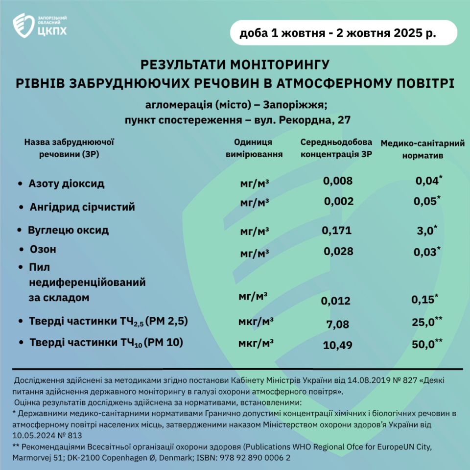 Результати моніторингу рівнів забруднюючих речовин в атмосферному повітрі доба 1- 2 жовтня 2025 року