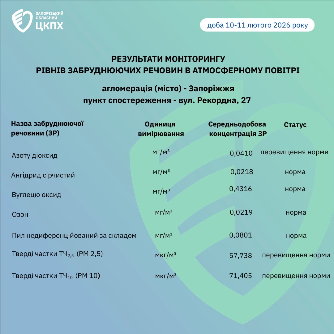 Результати моніторингу рівнів забруднюючих речовин в атмосферному повітрі доба 10-11 лютого 2026 року