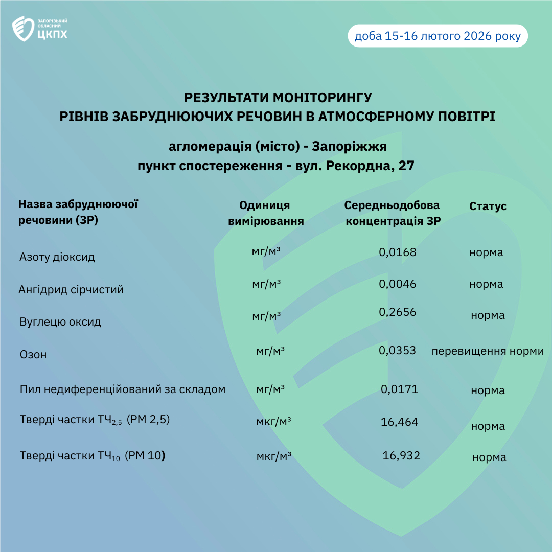 Результати моніторингу рівнів забруднюючих речовин в атмосферному повітрі доба 15-16 лютого 2026 року