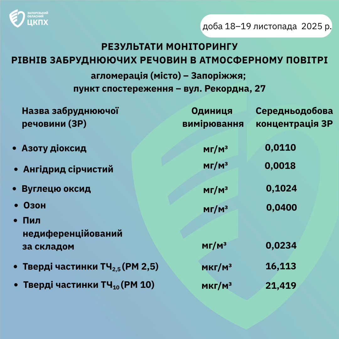 Результати моніторингу рівнів забруднюючих речовин в атмосферному повітрі доба 18-19 листопада 2025 рік