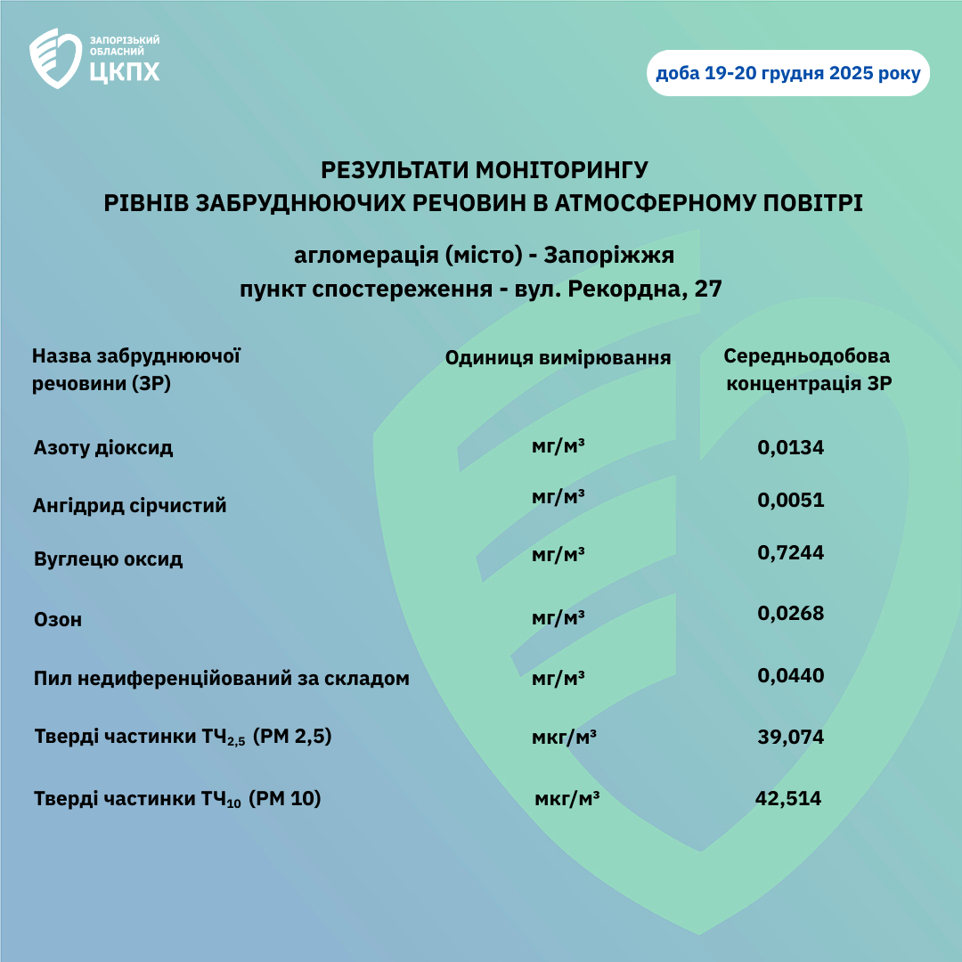 Результати моніторингу рівнів забруднюючих речовин в атмосферному повітрі доба 19-20 грудня 2025 року