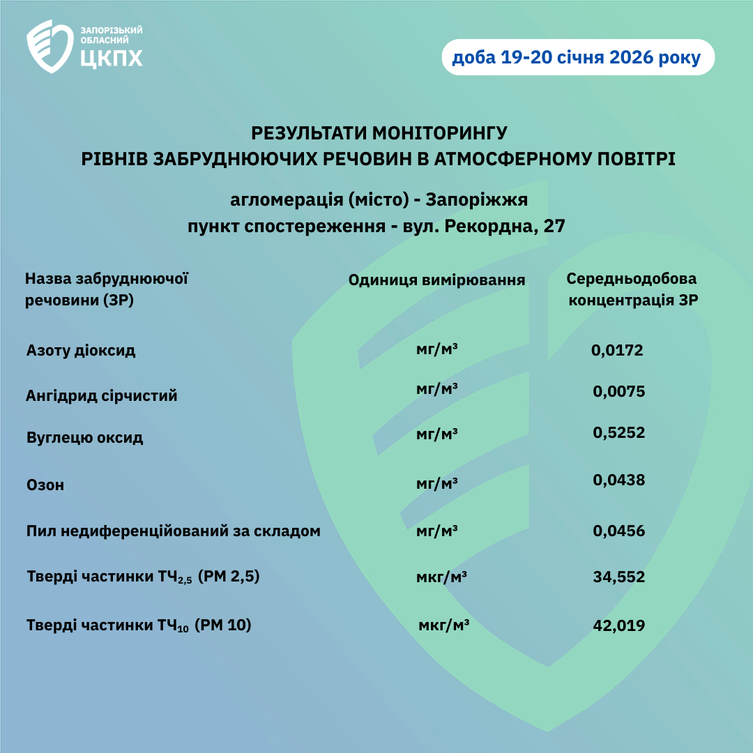 Результати моніторингу рівнів забруднюючих речовин в атмосферному повітрі доба 19-20 січня