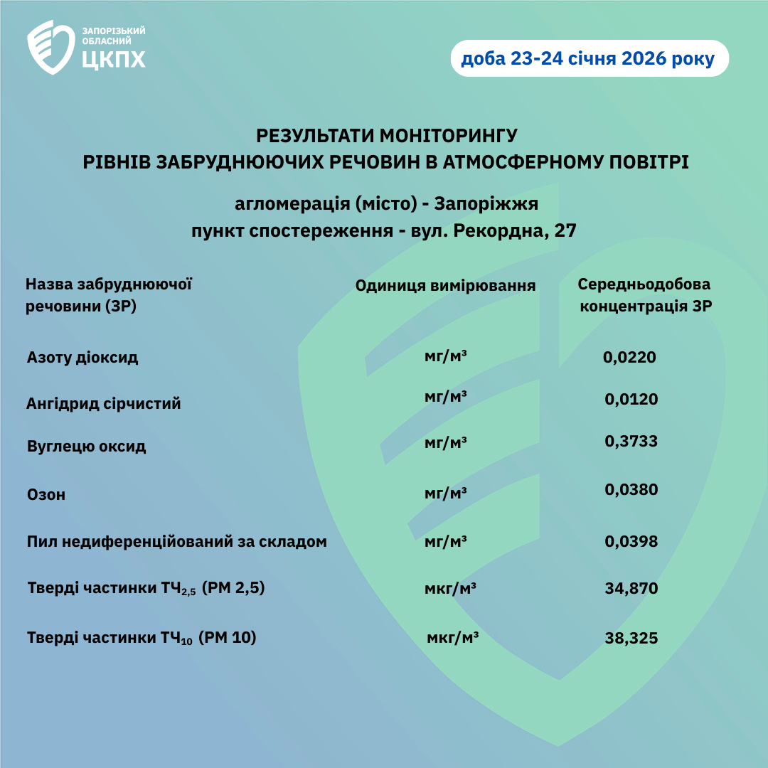 Результати моніторингу рівнів забруднюючих речовин в атмосферному повітрі доба 23-24 січня 2026 року