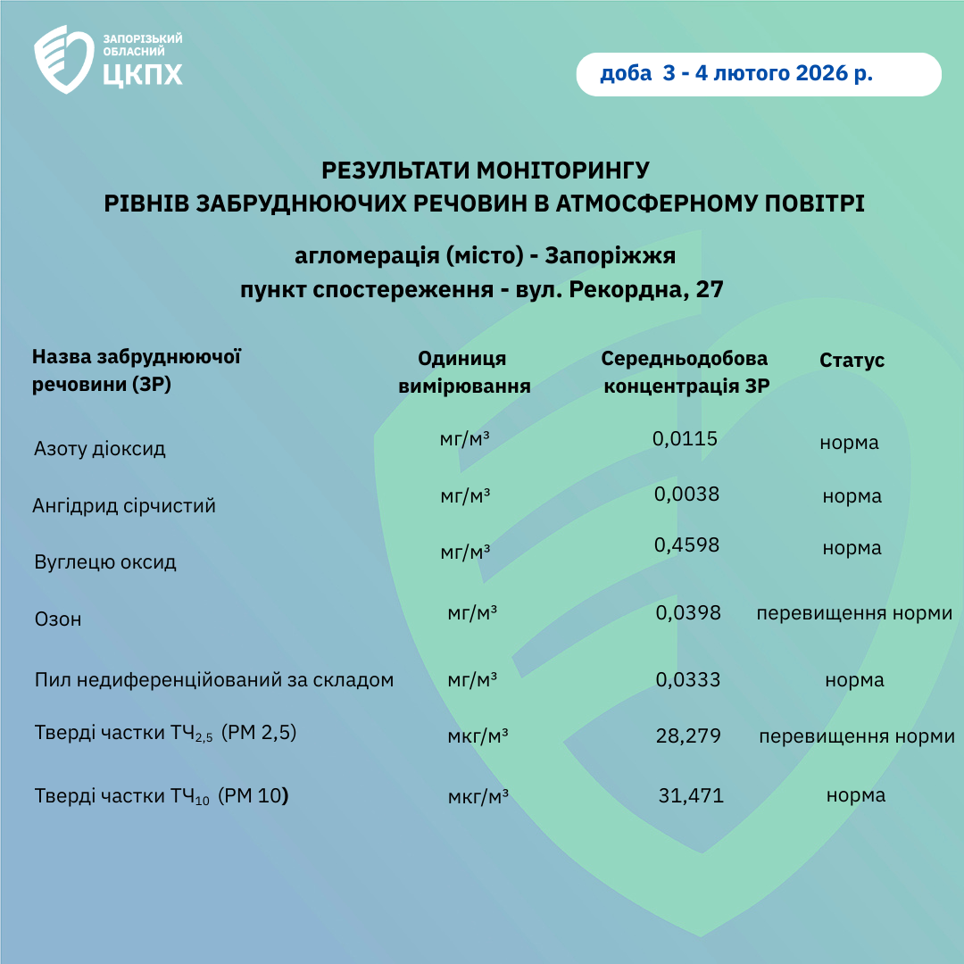 Результати моніторингу рівнів забруднюючих речовин в атмосферному повітрі доба 3-4 лютого 2026 року