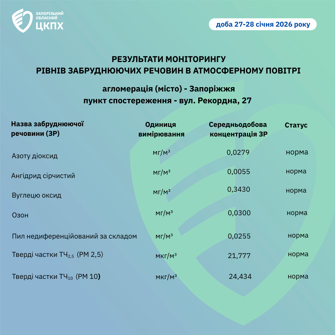 Результати моніторингу рівнів забруднюючих речовин в атмосферному повітрі доба 27-28 січня 2026 року