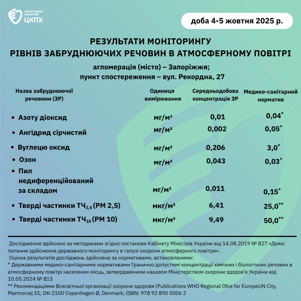 Результати моніторингу рівнів забруднюючих речовин в атмосферному повітрі доба 4-5 жовтня 2025 року