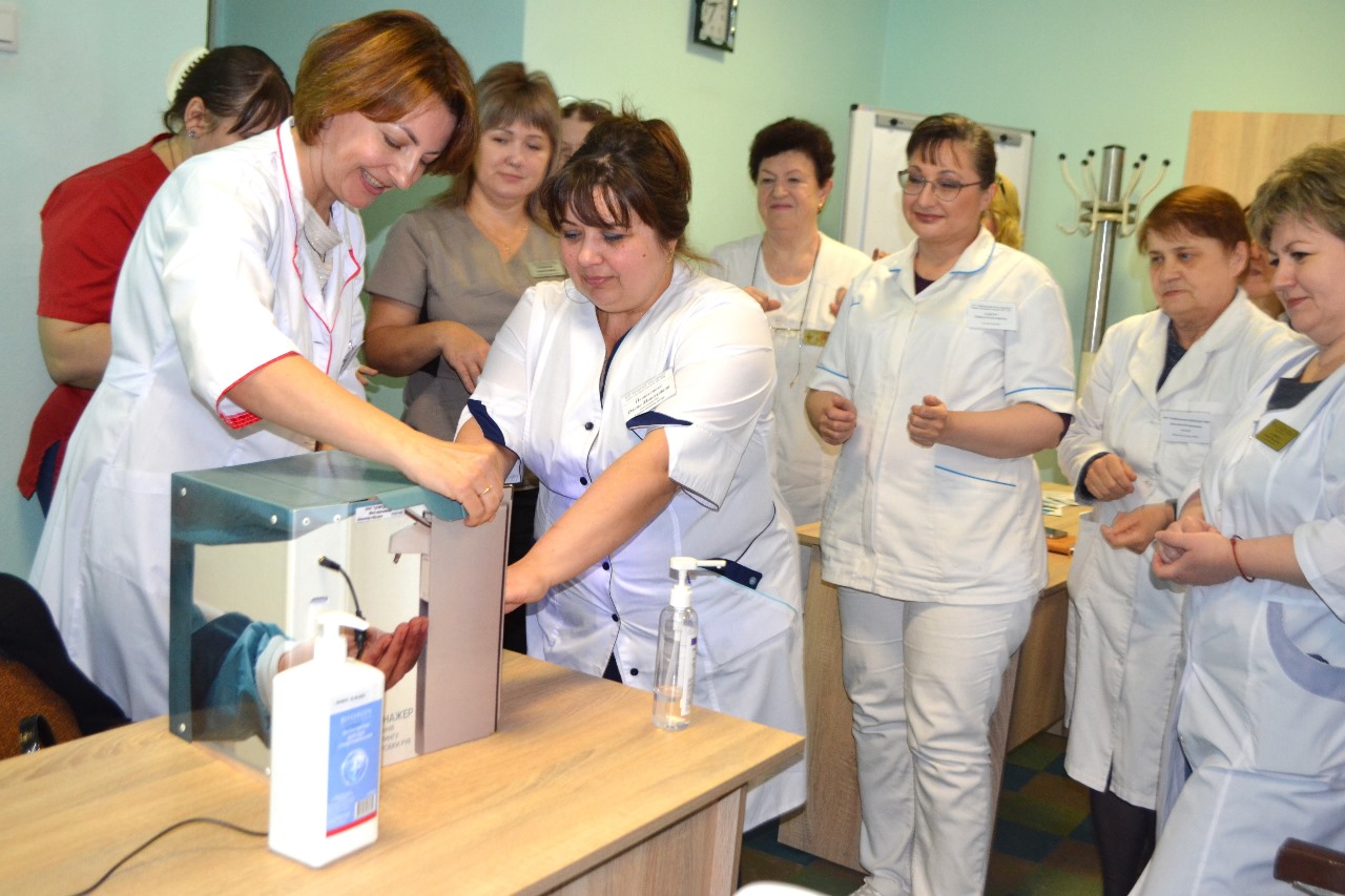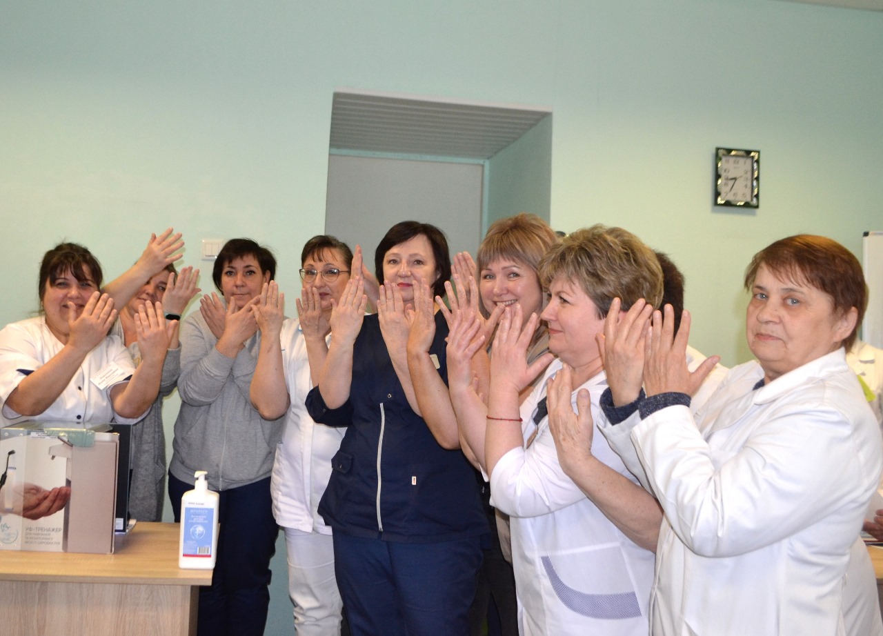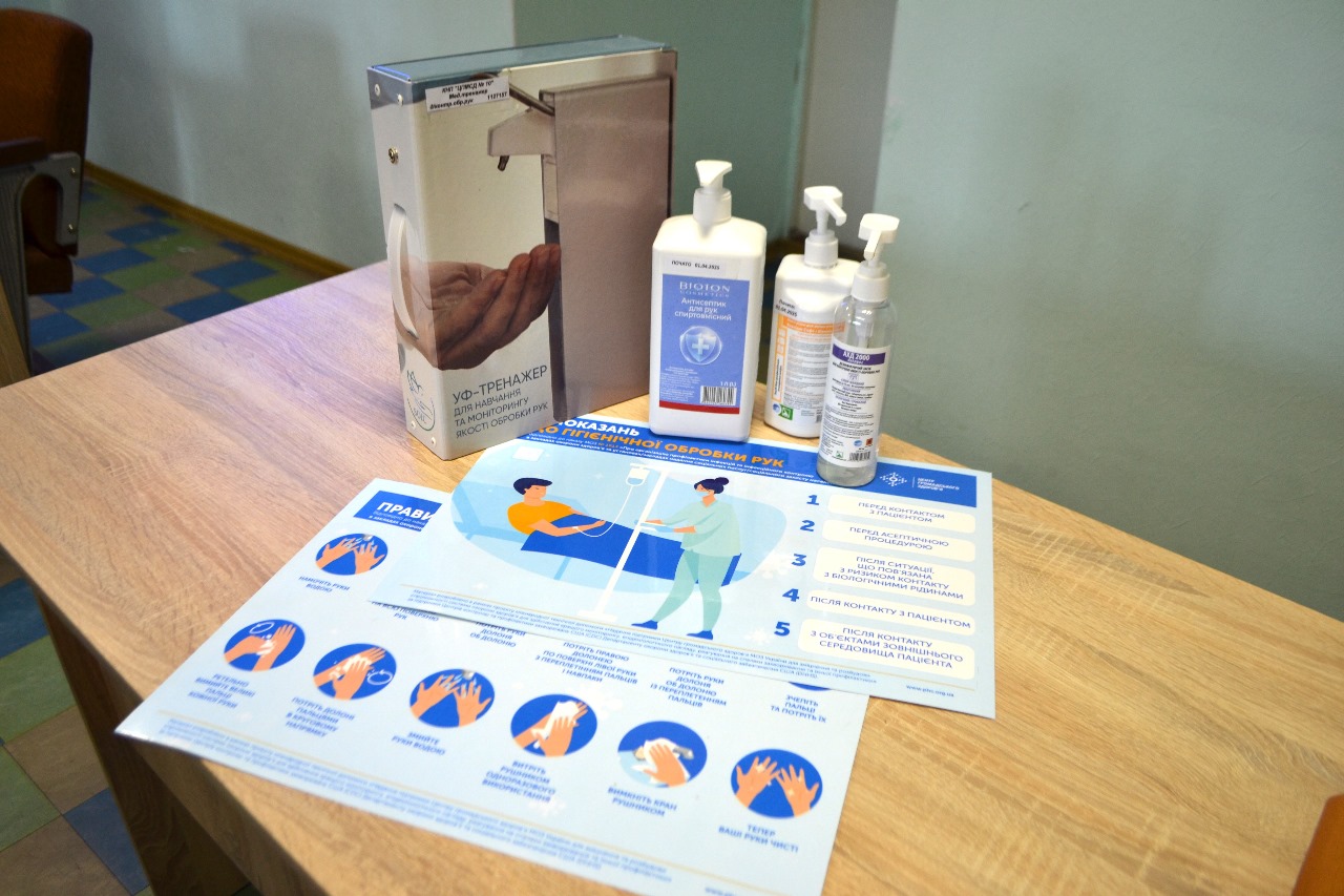 Під час зустрічі проведено навчання з гігієни рук для медичного персоналу закладу з відпрацюванням практичних навичок та моніторингом якості обробки рук антисептиком за допомогою медичного тренажеру UV-BOX (УФ-Бокс). Таке навчання дозволяє ефективно перевірити та забезпечити правильність обробки рук антисептичними засобами, що є критично важливим для запобігання інфекціям у медичних установах.
