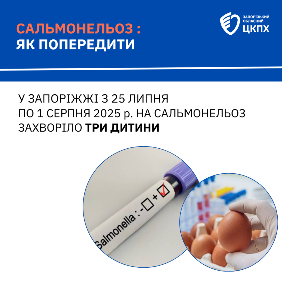 У Запоріжжі з 25 липня по 1 серпня 2025 року на сальмонельоз захворіло три дитини – 2024, 2022 та 2014 років народження.