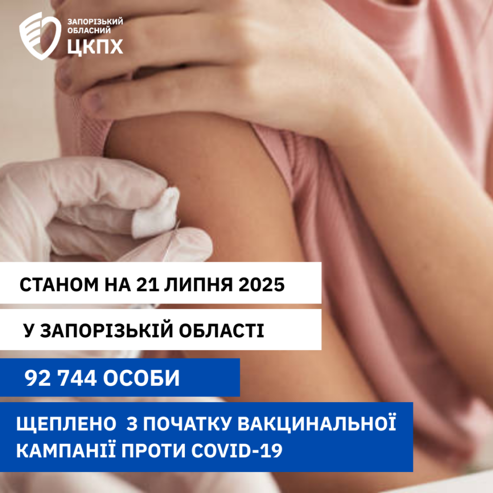 З початку повномасштабної агресії рф на території Запорізької області, підконтрольній України, станом на 21 липня 2025 року щеплено 92 744 особи, в т.ч. отримали 2 щеплення 10 631 особа. Додаткову дозу отримало 279 осіб, бустерну дозу отримали 62 423 особи. Дві бустерні дози отримали 11 864 особи, додаткову бустерну дозу – 1 106 осіб.