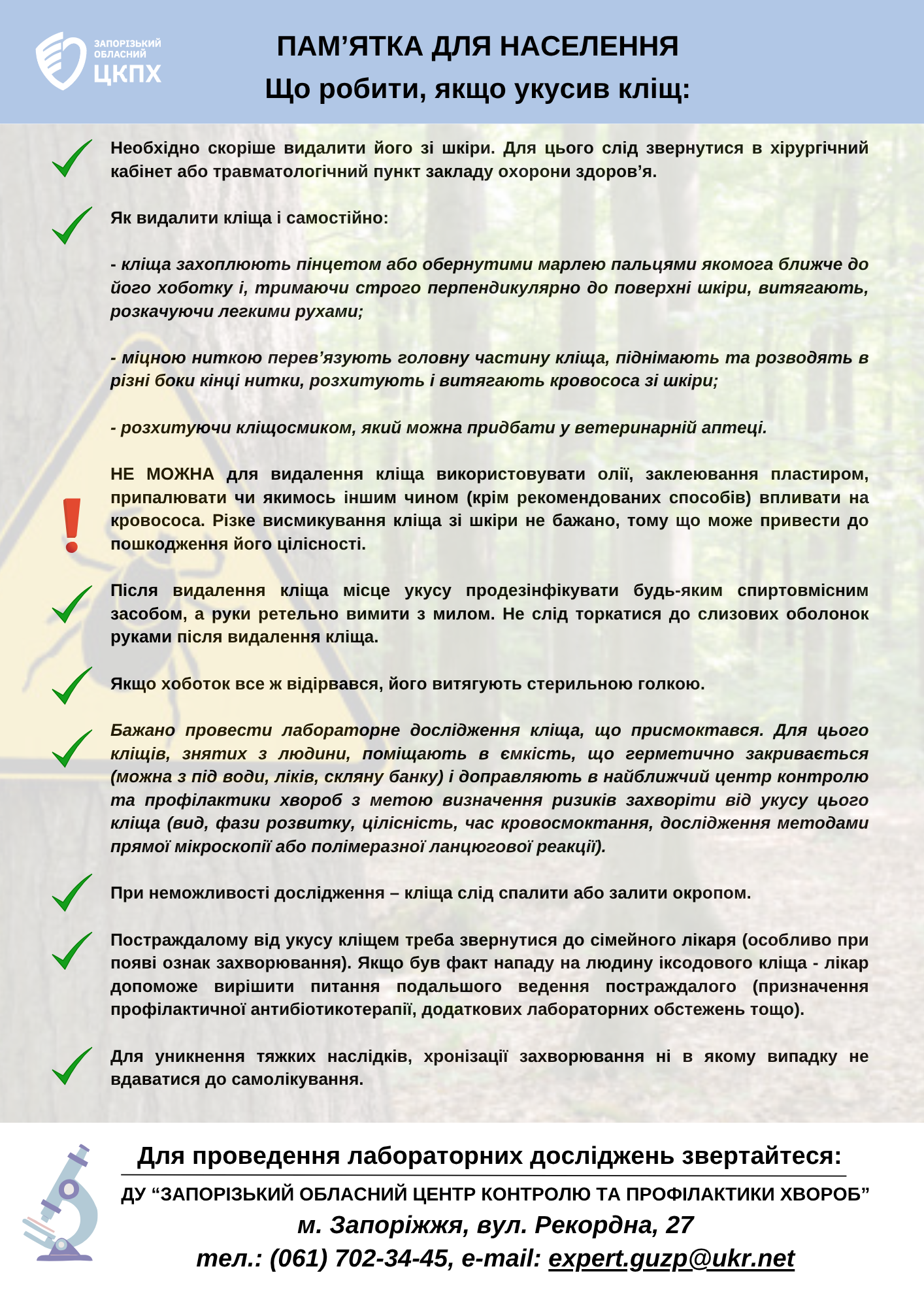 Для звернень з приводу лабораторних досліджень іксодових кліщів можна звертатися в Запорізький обласний центр контролю та профілактики хвороб за адресами: вул. Рекордна 27; тел: (061) 702-34-45