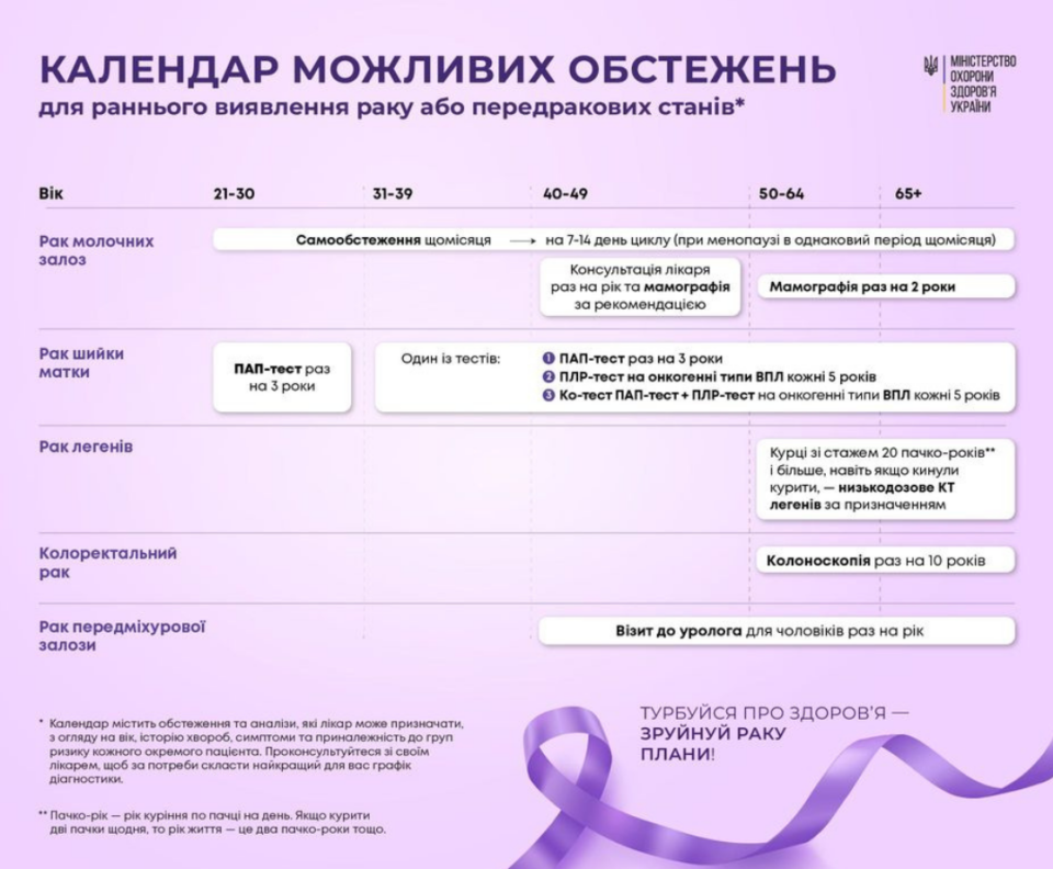 В успішному лікуванні онкозахворювань важливу роль відіграє раннє виявлення – воно поліпшує прогноз щодо лікування та підвищує шанси на повне одужання. Зверніть увагу на Календар можливих обстежень для раннього виявлення раку або передракових станів від МОЗ України.