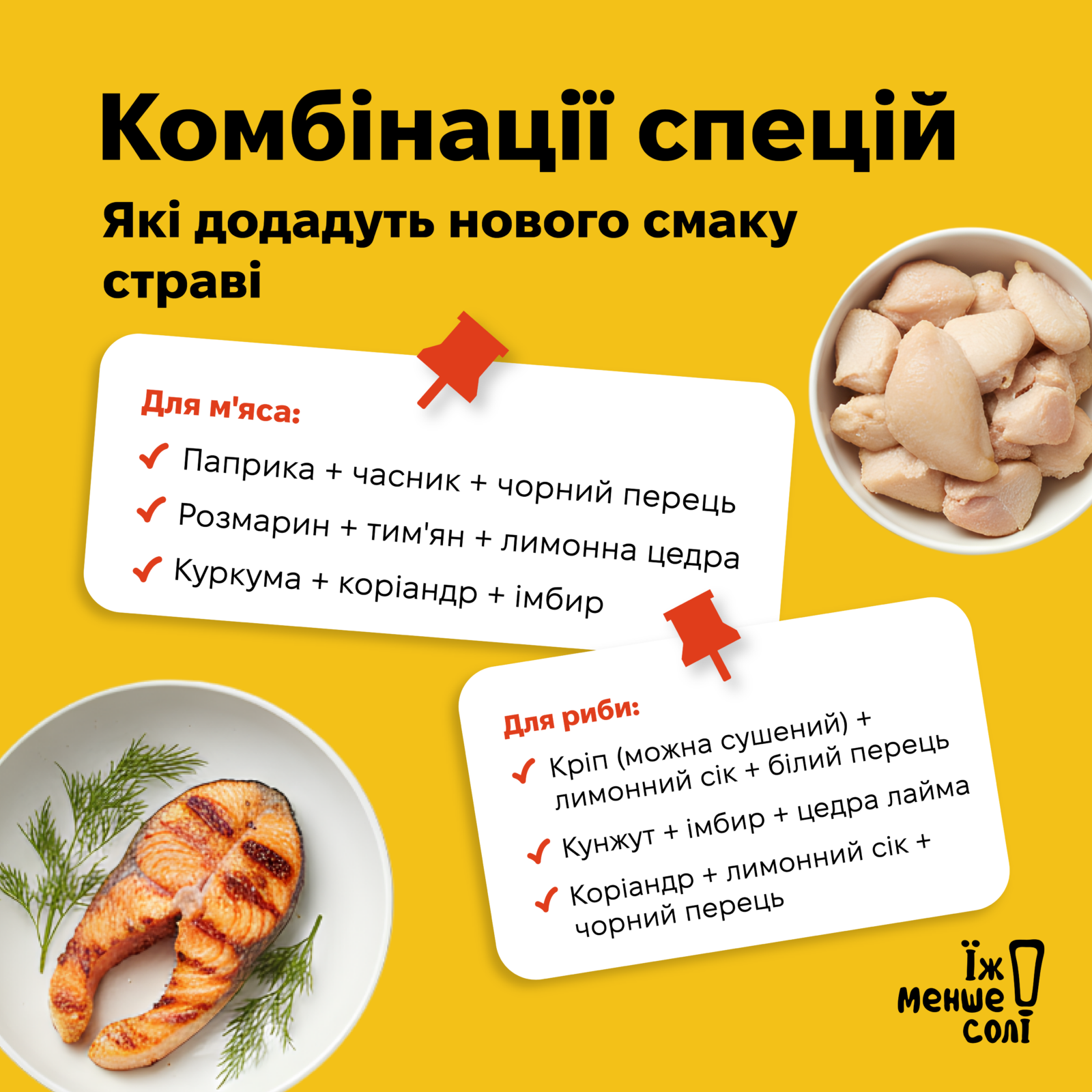 Для м’яса: Паприка + часник + чорний перець; Розмарин + тим’ян + лимонна цедра; Куркума + коріандр + імбир.