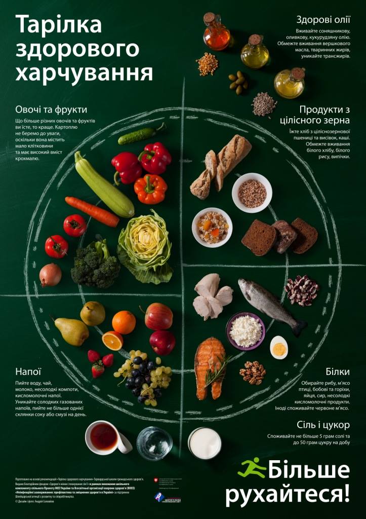 А чи знаєте ви, що в щоденному раціоні людини обов’язково овочі та фрукти, білки, продукти з цілісного зерна? Тарілка здорового харчування – це сучасна модель здорового харчування, яка відображає збалансоване щоденне меню.