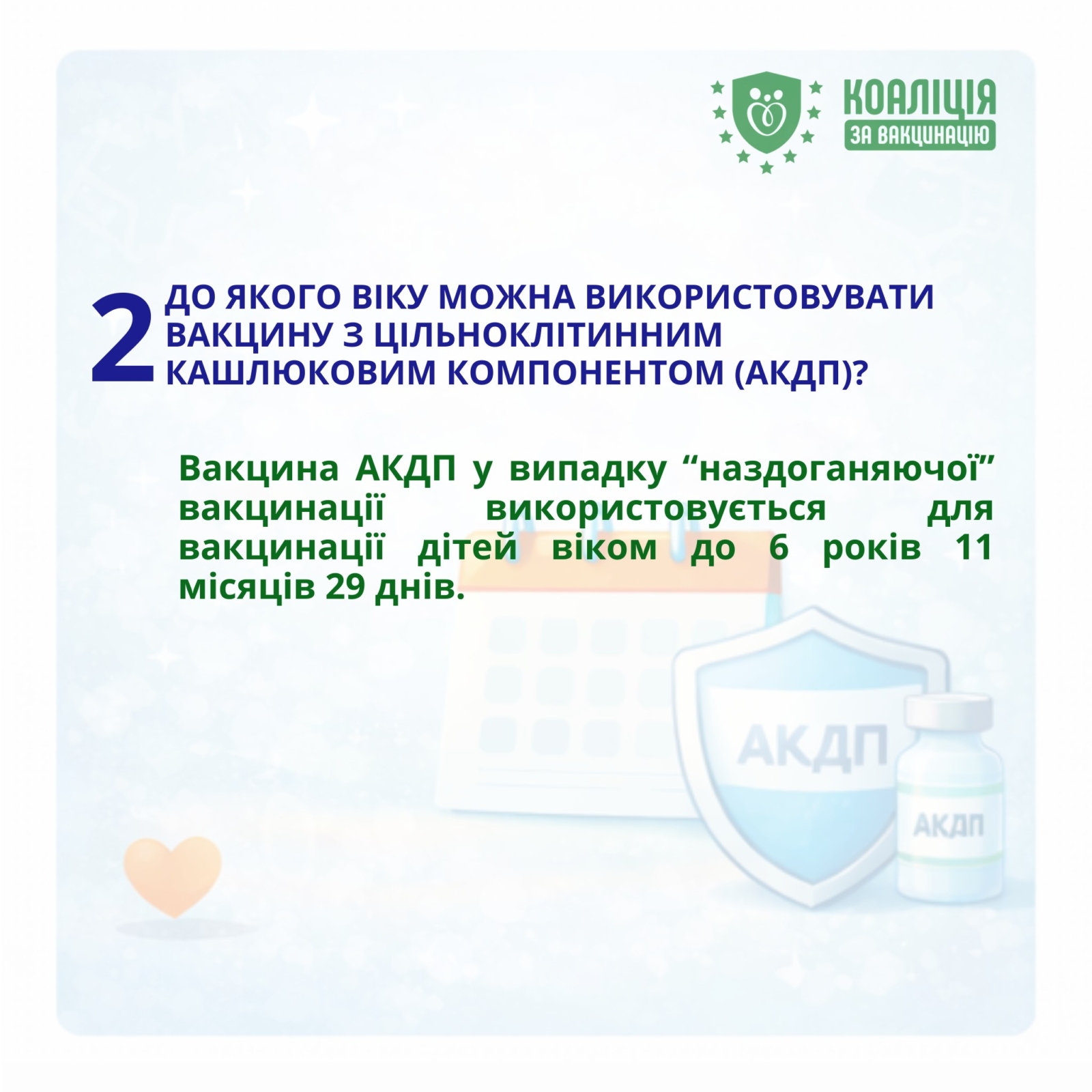 Відповідь: Вакцина АКДП у випадку “наздоганяючої” вакцинації використовується для вакцинації дітей віком до 6 років 11 місяців 29 днів.