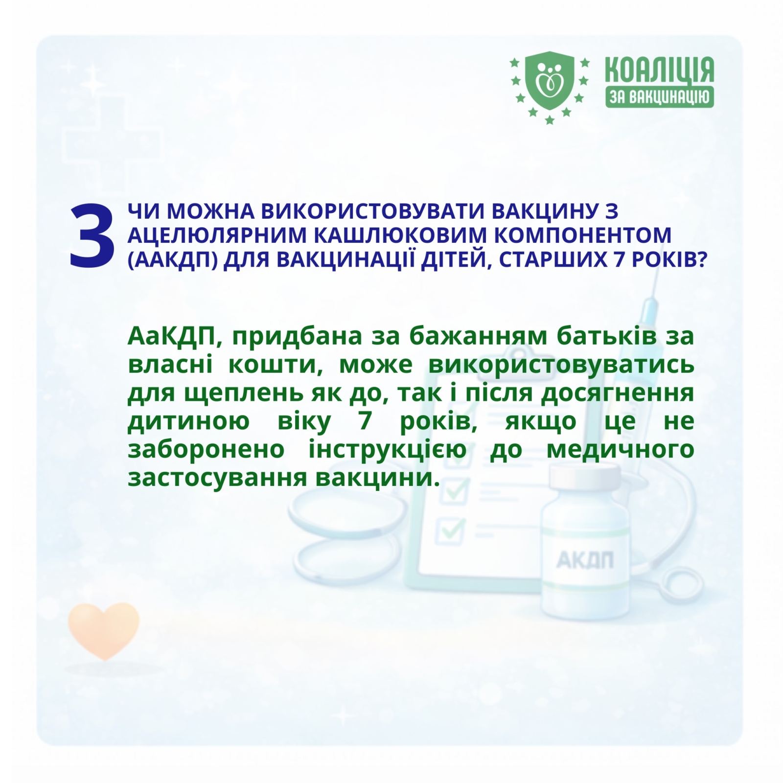 Відповідь: АаКДП, придбана за бажанням батьків за власні кошти, може використовуватись для щеплень як до, так і після досягнення дитиною віку 7 років, якщо це не заборонено інструкцією до медичного застосування вакцини.