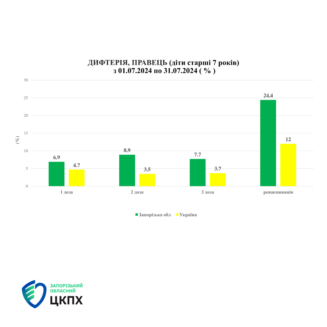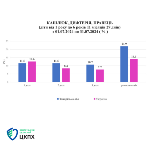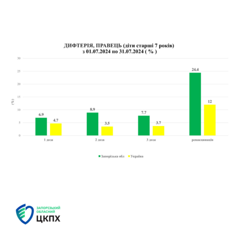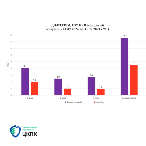 За даними діаграм щеплень дітей та дорослих, підготовлених відділом імунопрофілактики Запорізького обласного ЦКПХ за липень 2024 року, спостерігаємо необхідність по надолуження щеплень проти дифтерії, правцю та кашлюку, як для дітей, так і для дорослих, зокрема на рівні громад. Ми щоденно працюємо спільно з органами влади на місцях, щоб забезпечити постійний доступ громадян до вакцинації.