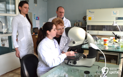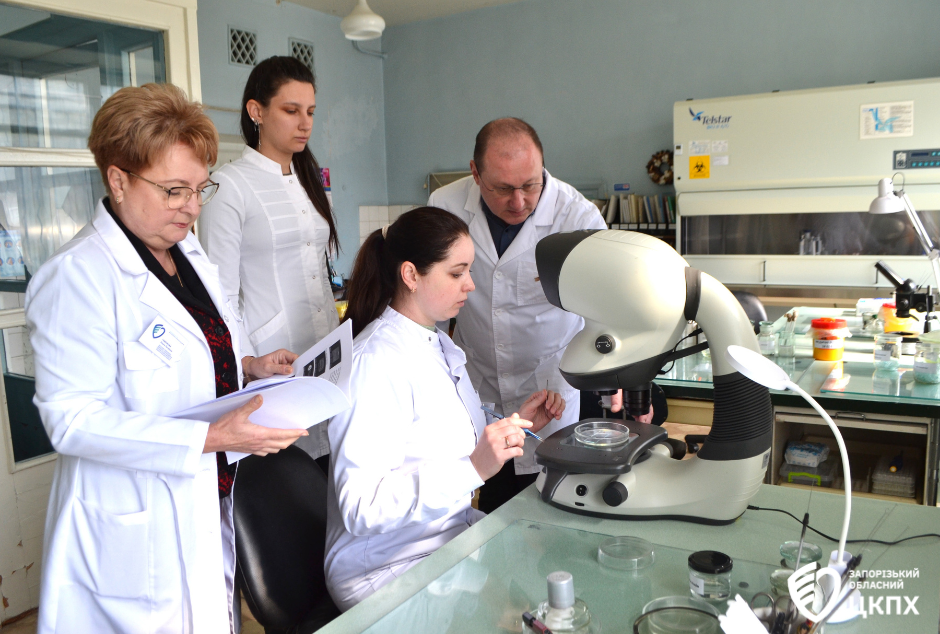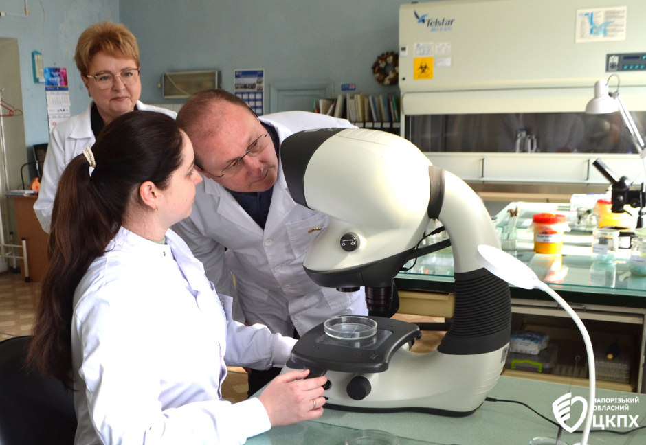 На фото – генеральний директор Запорізького ОЦКПХ Тарас Тищенко та заступник із впровадження системи управління якістю лабораторних досліджень Ольга Гаврікова разом із фахівчинями лабораторії знайомляться з роботою нового мікроскопу.