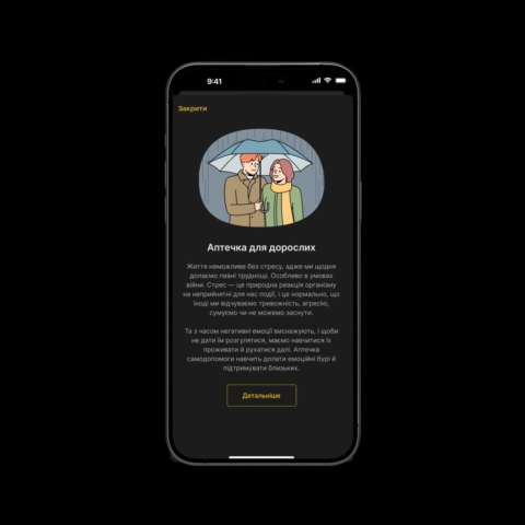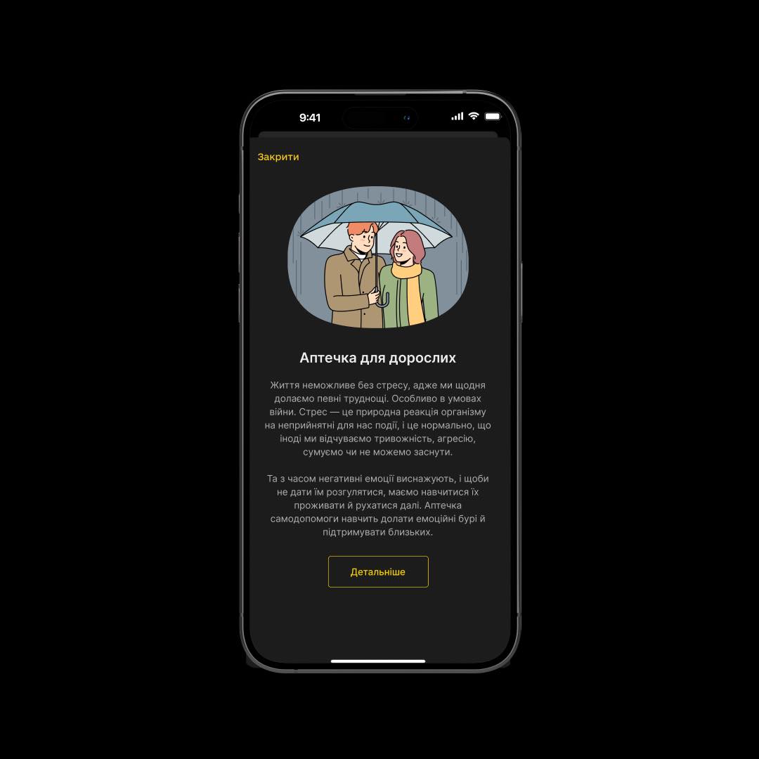 Натиснувши на повідомлення, користувач потрапляє в підрозділ «Аптечка психологічної самодопомоги» з порадами для дорослих, дітей та ветеранів. У цьому підменю зібрані техніки допомоги собі та дітям, ігри та вправи для стабілізації емоційного стану, а також контакти спеціалістів.