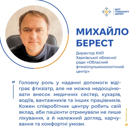 Михайло Берест очолює ОФПЦ від літа минулого року. Тут лікують людей із туберкульозом, зокрема лікарсько-стійким. За словами директора, команда закладу докладає всіх зусиль, щоб надавати якісні послуги пацієнтам, попри щоденні обстріли та інші виклики, пов’язані з війною.