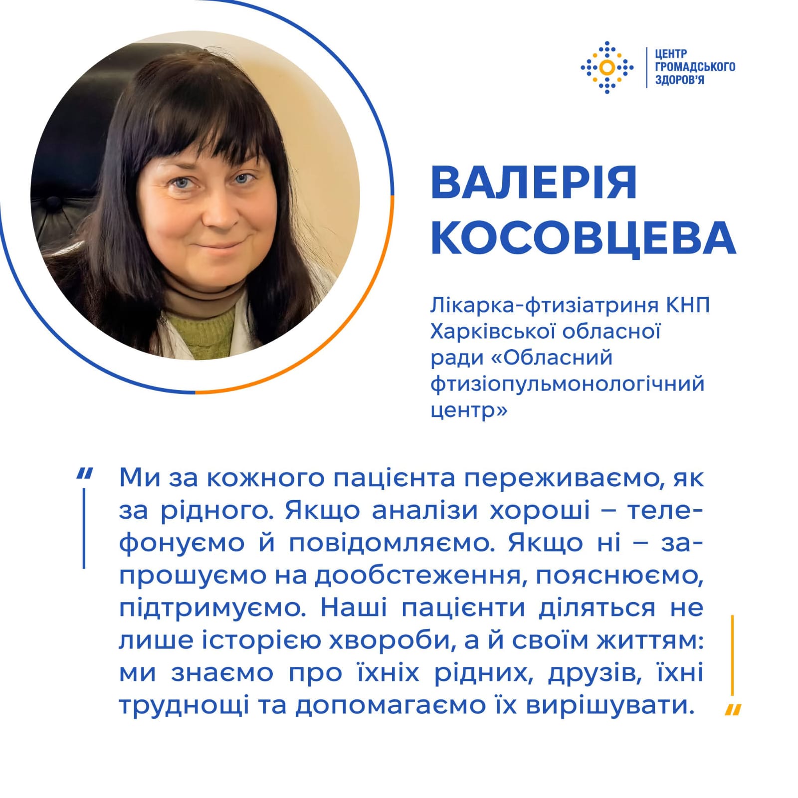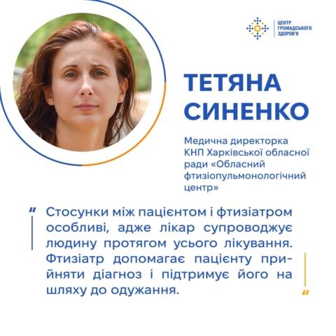 «Під час прийому я супроводжую пацієнтів, допомагаю їм зорієнтуватися, бо вони часто розгублені. І, звісно, це нормальна реакція, адже коли люди дізнаються про діагноз туберкульоз, вони впадають у ступор, не одразу сприймають інформацію. Тому ми їх підтримуємо, пояснюємо, що туберкульоз — виліковний, головне дотримуватись рекомендацій лікаря. І тоді все буде добре».