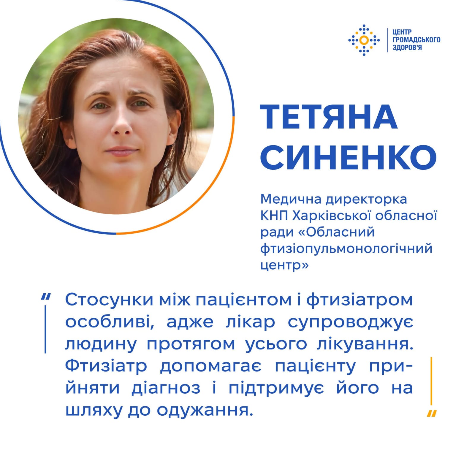 Також медична директорка розповіла про формування теплих, приязних взаємин між фтизіатрами та їхніми пацієнтами: «Стосунки між пацієнтом і фтизіатром особливі, адже лікар супроводжує людину протягом усього лікування — а це тривалий час, — обстежує її родину, постійно слідкує за станом здоров’я. Фтизіатр допомагає пацієнту прийняти діагноз і підтримує його на шляху до одужання».