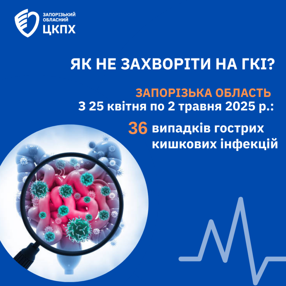 З 25 квітня по 2 травня 2025 р. в Запорізькій області зареєстровано 36 випадків гострих кишкових інфекцій, показник – 4,2 на 100 тисяч населення (на двох попередніх тижнях зареєстровано 51 та 31 випадки відповідно).
