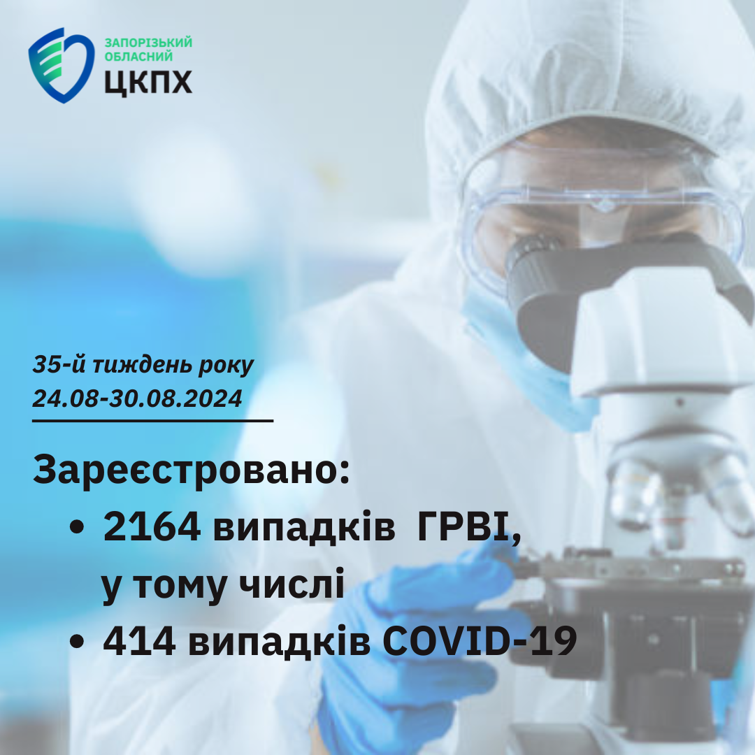 За останній 35-й тиждень 2024 року в Запорізькій області зареєстровано 2164 випадків гострої респіраторної вірусної інфекці, у тому числі 414 випадків захворювання COVID-19.