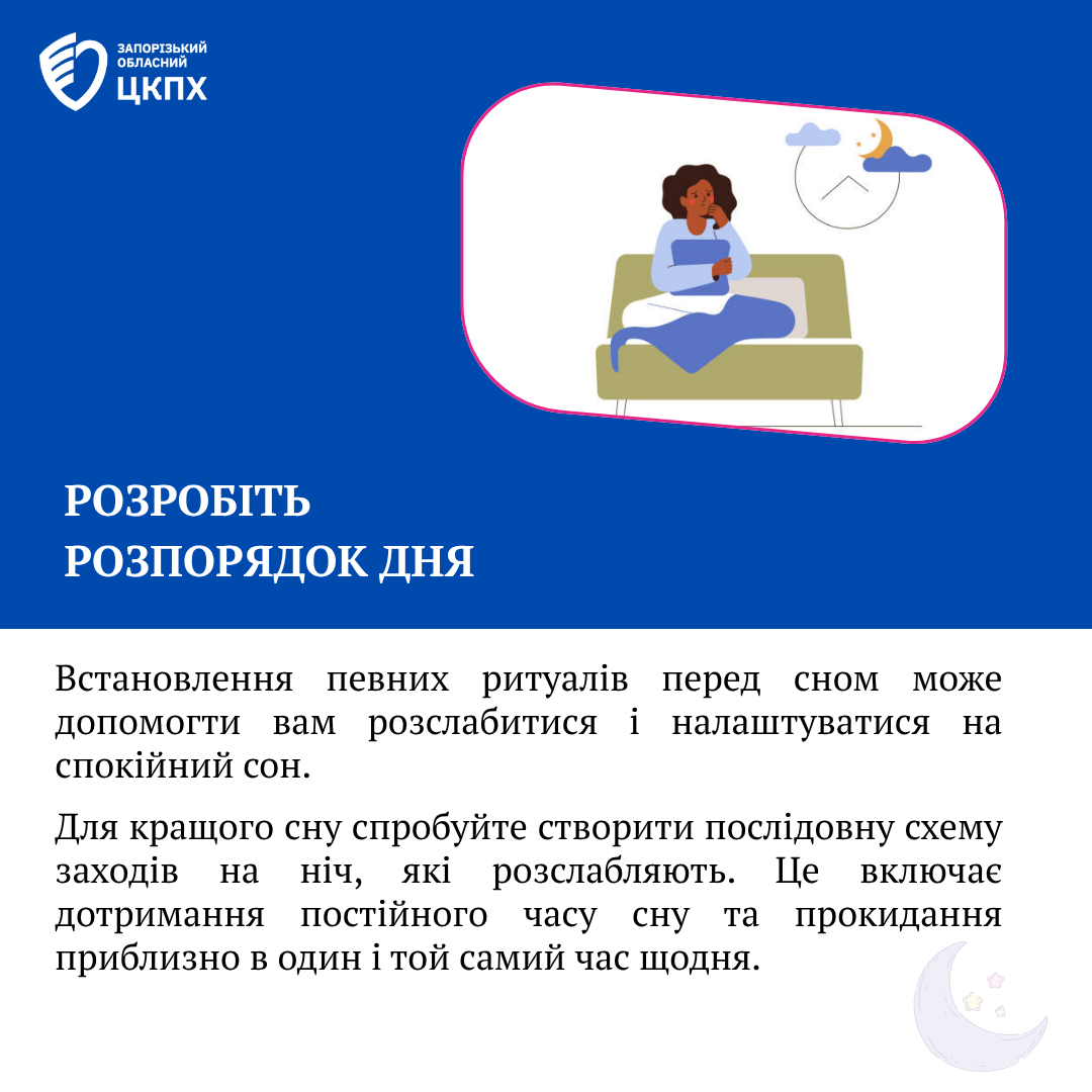 Розробіть розпорядок дня: встановлення певних ритуалів перед сном може допомогти вам розслабитися і налаштуватися на спокійний сон. Для кращого сну спробуйте створити послідовну схему заходів на ніч, які розслабляють. Це включає дотримання постійного часу сну та прокидання приблизно в один і той самий час щодня.