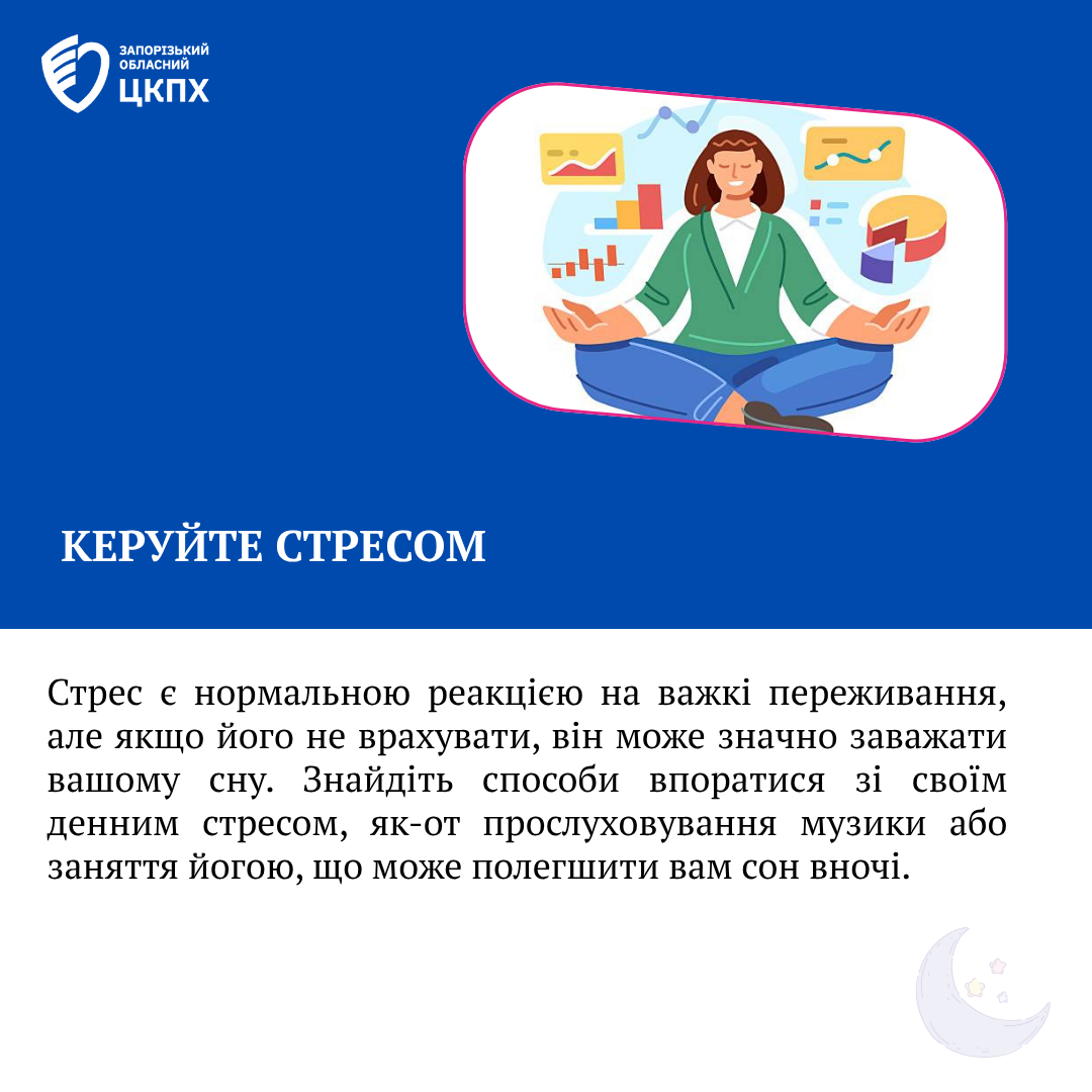 Керуйте стресом: Стрес є нормальною реакцією на важкі переживання, але якщо його не врахувати, він може значно заважати вашому сну. Знайдіть способи впоратися зі своїм денним стресом, як-от прослуховування музики або заняття йогою, що може полегшити вам сон вночі.