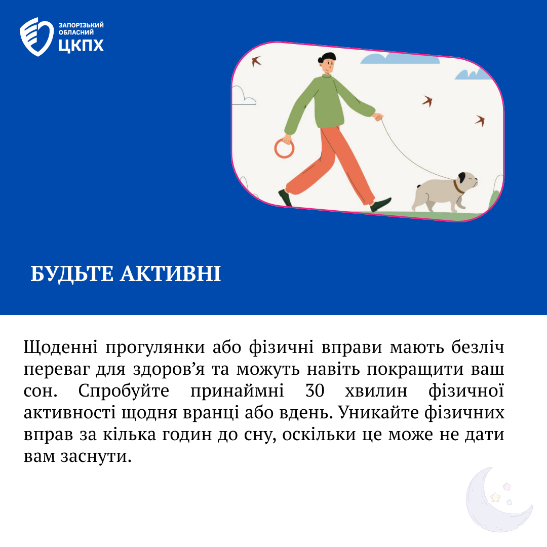 Будьте активні: Щоденні прогулянки або фізичні вправи мають безліч переваг для здоров’я та можуть навіть покращити ваш сон. Спробуйте принаймні 30 хвилин фізичної активності щодня вранці або вдень. Уникайте фізичних вправ за кілька годин до сну, оскільки це може не дати вам заснути.