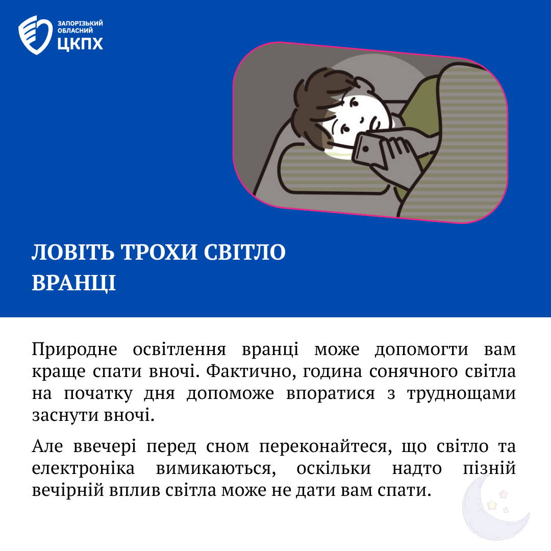 Ловіть трохи світла вранці: Природне освітлення вранці може допомогти вам краще спати вночі. Фактично, година сонячного світла на початку дня допоможе впоратися з труднощами заснути вночі. Але ввечері перед сном переконайтеся, що світло та електроніка вимикаються, оскільки надто пізній вечірній вплив світла може не дати вам спати.