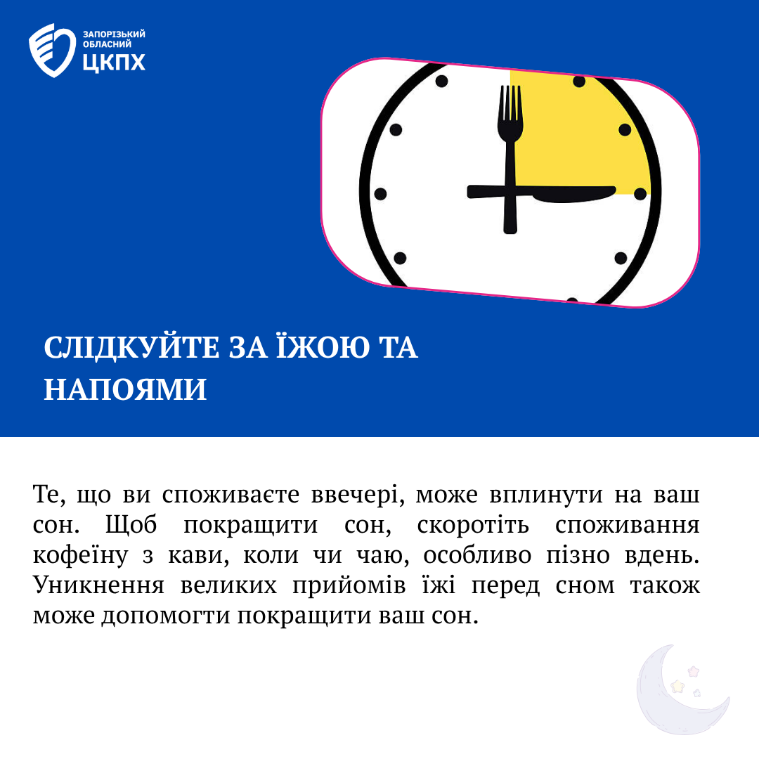 Слідкуйте за їжею та напоями: Те, що ви споживаєте ввечері, може вплинути на ваш сон. Щоб покращити сон, скоротіть споживання кофеїну з кави, коли чи чаю, особливо пізно вдень. Уникнення великих прийомів їжі перед сном також може допомогти покращити ваш сон.