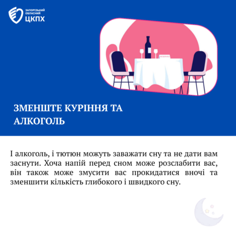 Зменште куріння та алкоголь: і алкоголь , і тютюн можуть заважати сну та не дати вам заснути. Хоча напій перед сном може розслабити вас, він також може змусити вас прокидатися вночі та зменшити кількість глибокого і швидкого сну.