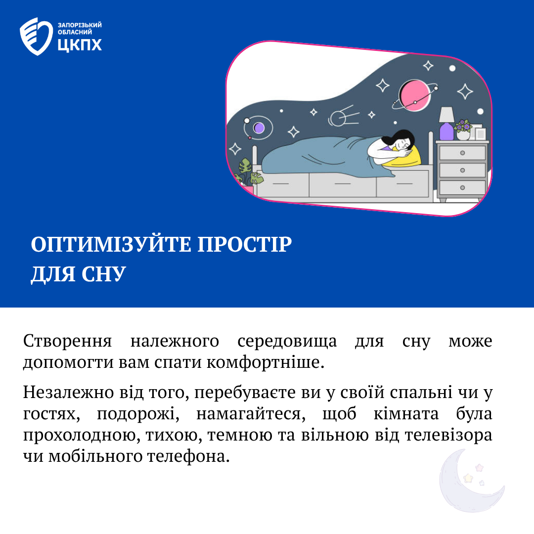 Оптимізуйте простір для сну. Створення належного середовища для сну може допомогти вам спати комфортніше. Незалежно від того, перебуваєте ви у своїй спальні чи у гостях, подорожі, намагайтеся, щоб кімната була прохолодною, тихою, темною та вільною від телевізора чи мобільного телефона.