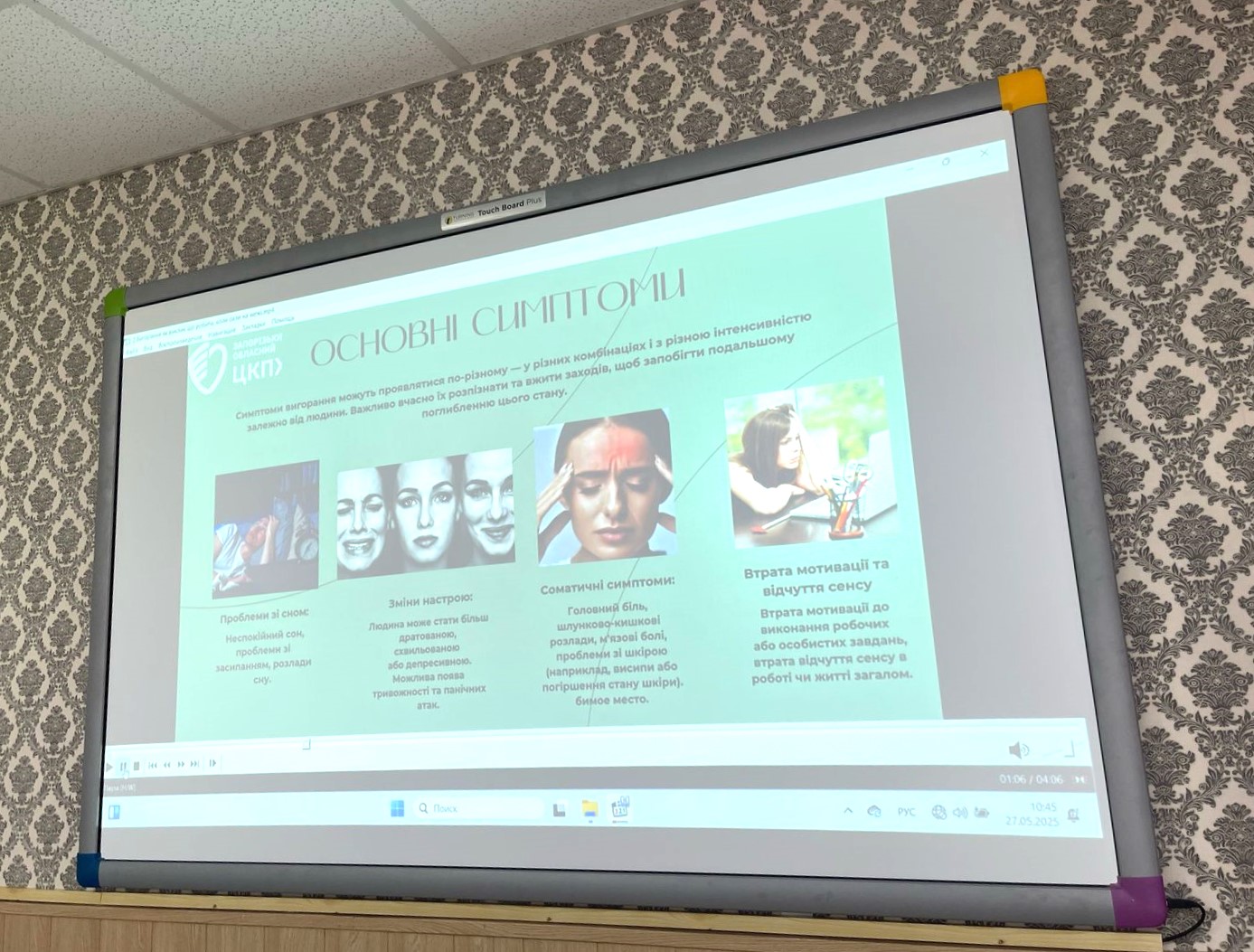 Освітні заходи щодо підтримки метального здоров’я корисні не тільки для дітей, але й важливі для дорослих. Як бути емоційно стійкими, зберігати життєвий баланс, тримати стрес під контролем та уникнути емоційного вигорання – тема зустрічі з вчителями Загальноосвітньої санаторної школи-інтернат № 7.