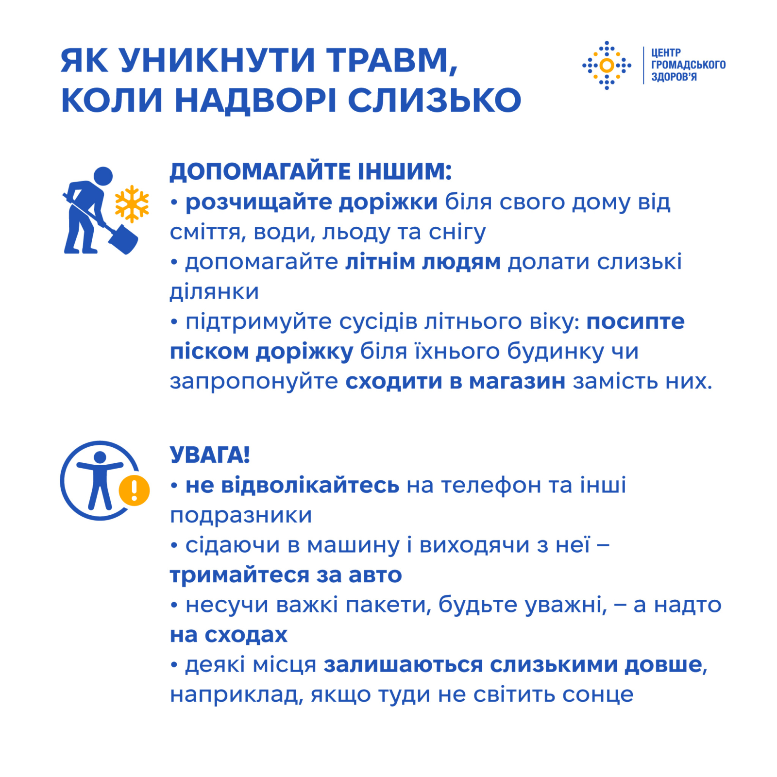 За прогнозами синоптиків і далі очікуються снігопади, а разом з ними зростають ризики сезонного травматизму. Слизькі тротуари, короткий світловий день і можливі відключення електроенергії ускладнюють видимість і роблять пересування менш безпечним. За таких умов імовірність посковзнутися, впасти і отримати травму значно зростає.