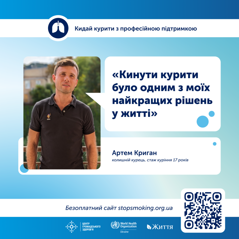 «Кинути курити було одним з найкращих рішень у житті. Я курив аж 17 років, але три роки тому все ж зміг подолати залежність. Головне – зрозуміти причину, чому тобі потрібно відмовитися від куріння. Знаєш, яка моя? Я не люблю бути залежним, для мене це прояв слабкості. А сильні люди завжди перемагають свої слабкості та турбуються про близьких, аби не наражати їх на шкідливий тютюновий дим», – поділився Артем Криган, колишній курець.