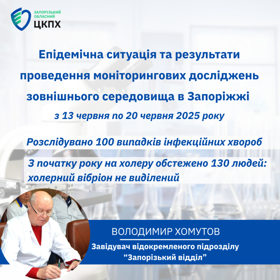 З 13 червня по 20 червня 2025 року фахівці відокремленого підрозділу «Запорізький відділ» продовжували аналіз епідемічної ситуації та проведення моніторингових досліджень зовнішнього середовища в місті Запоріжжі.